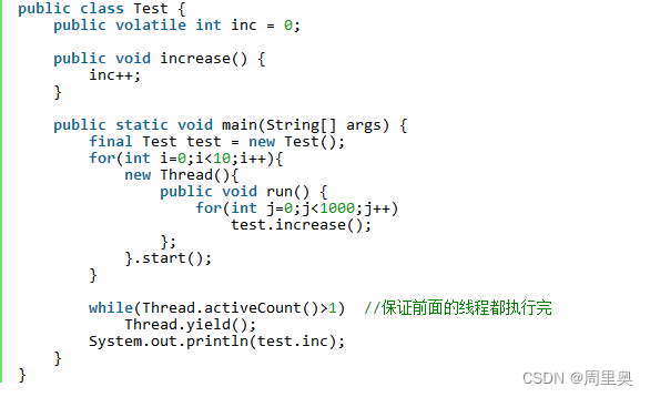 开启10个线程,每个线程都自加1000次,如果不出现线程安全的问题最终的结果应该就是:10*1000= 10000;可是运行多次都是小于10000的结果,问题在于 volatile 并不能保证原子性,在前面说过 counter++ 这并不是一个原子操作,包含了三个步骤:1.读取变量inc的值;2.对inc加一;3.将新值赋值给变量inc。如果线程 A 读取 inc 到工作内存后,其他线程对这个值已经做了自增操作后,那么线程A的这个值自然而然就是一个过期的值,因此,总结果必然会是小于100000的。
