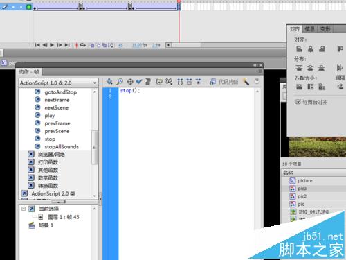 12、分别在15、30、45帧处打开其对应的动作面板,输入stop();语句。