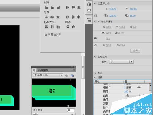 14、返回主场景,将影片剪辑元件2拖拽到舞台中,连续3次,调整他们的位置,并设置其大小为120*50,分别修改其实例名称为up1,up2,up3,并分别设置其投影滤镜效果。