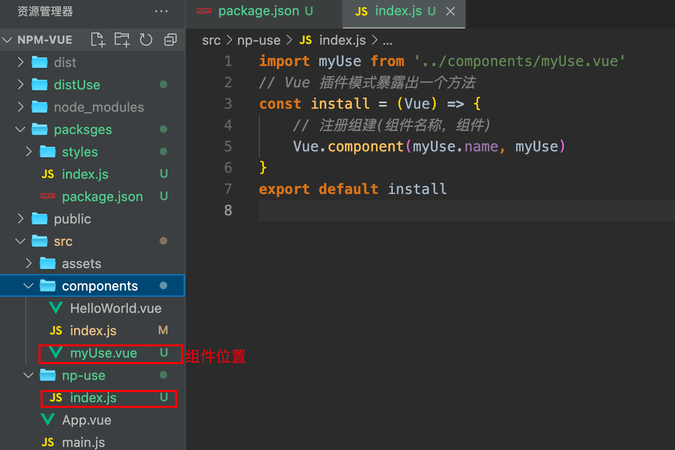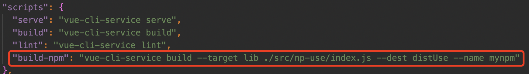 import myUse from '../components/myUse.vue' // Vue 插件模式暴露出一个方法 const install = (Vue) => { // 注册组件(组件名称,组件) Vue.component(myUse.name, myUse) } export default install接下来在package.json增加一段打包指令