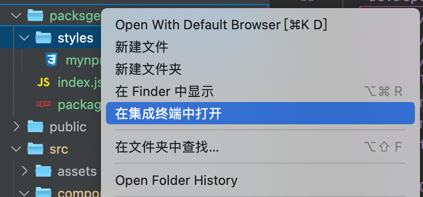 接下来选中 packsges 集成终端打开,运行 npm init -y 然后就会生成一个初始化的package.json文件
