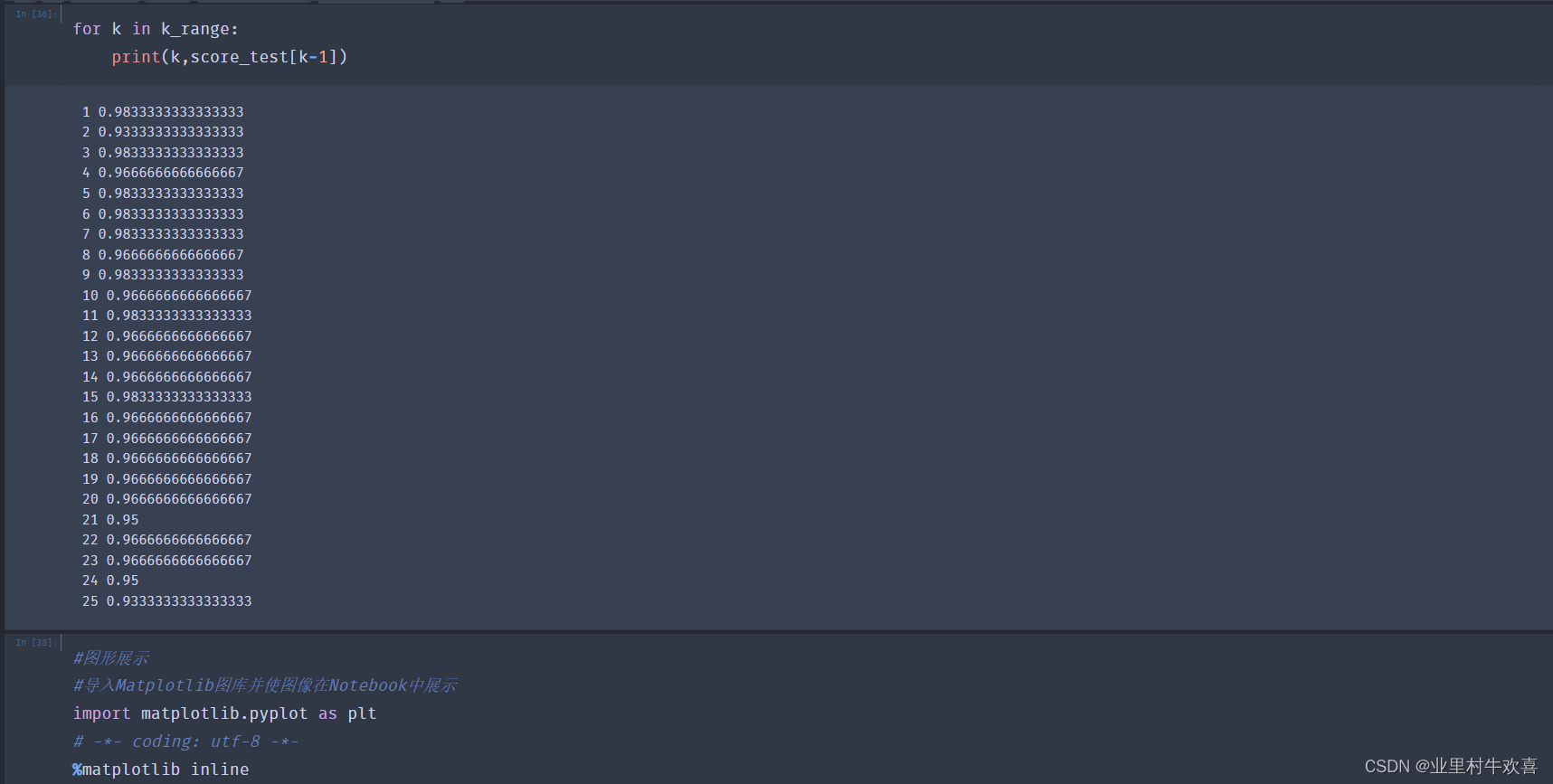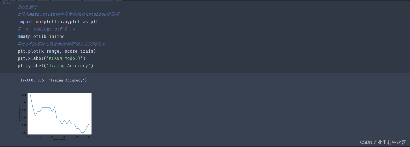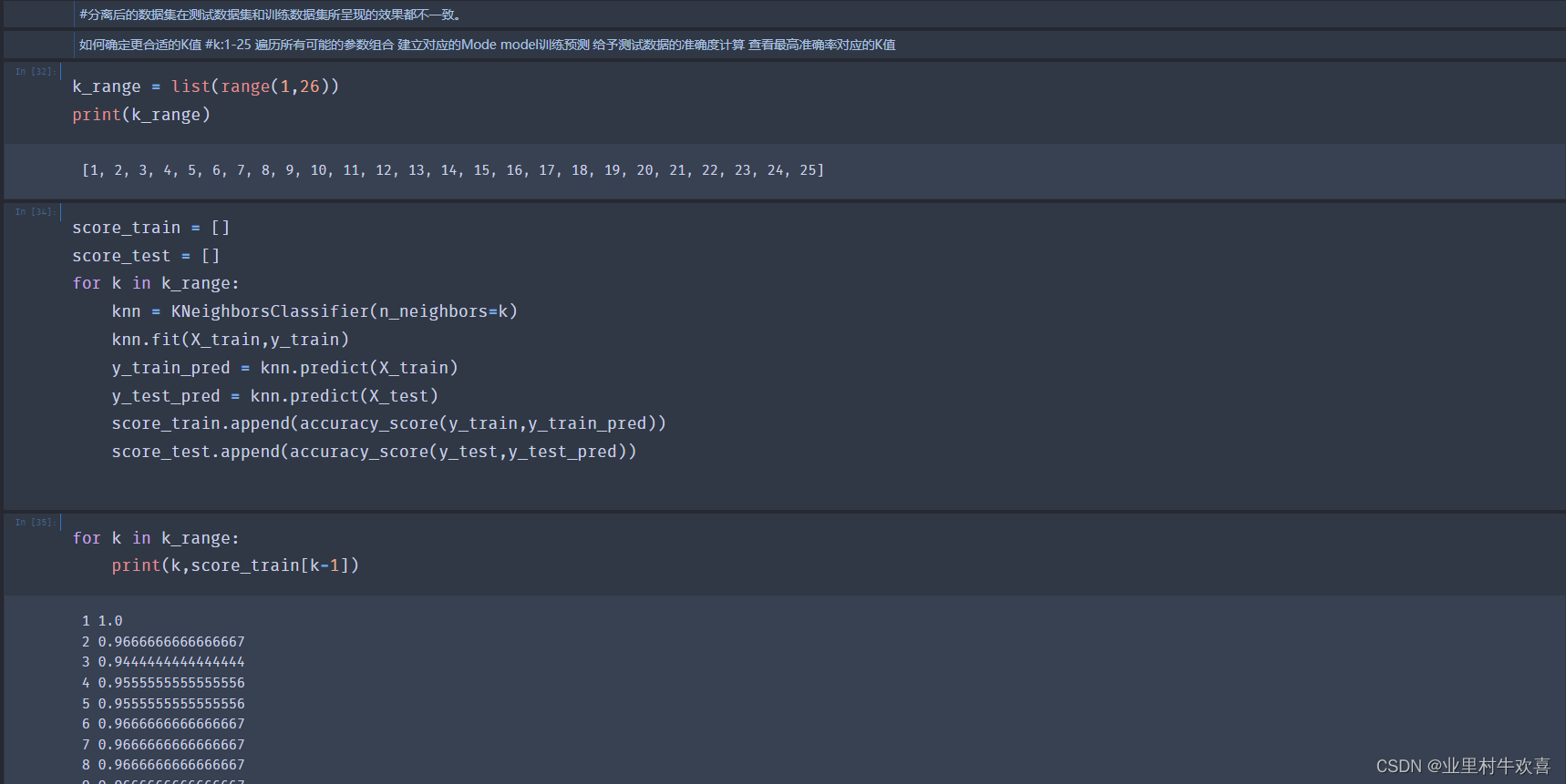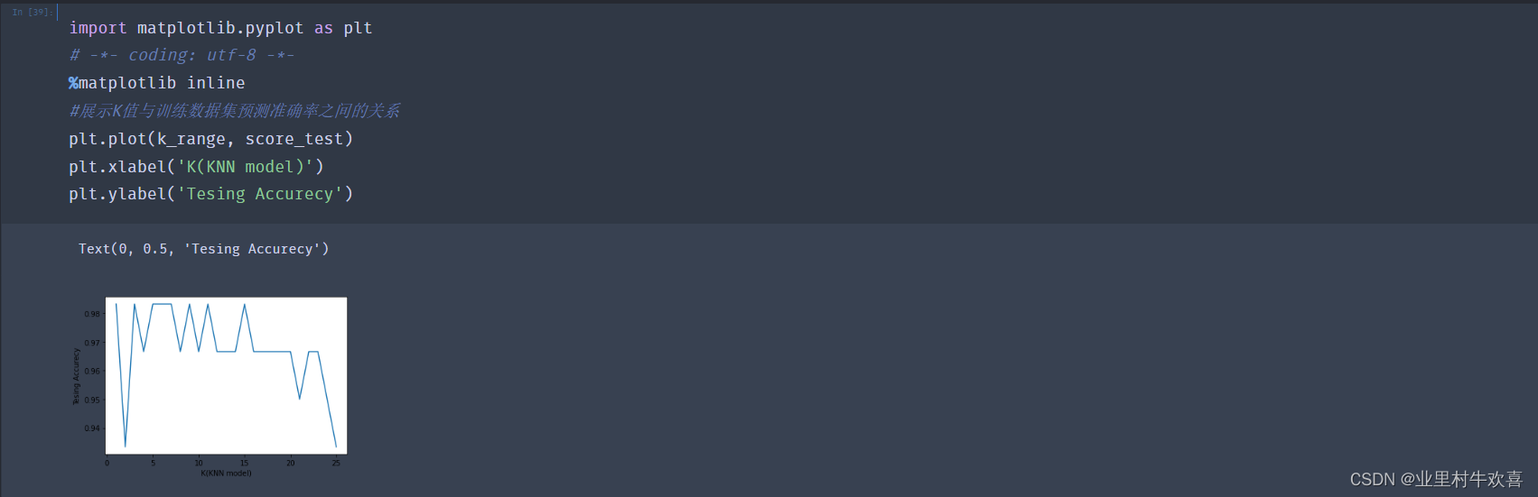总结:机器深度学习可以把数据集进行深度建模,以相应的算法进行测试和评估。上图模型训练的原理使用KNN模型、KNN模型适用寻找knn的值相等的数据集进行模型训练。模型评估使用准确率、数据分离和逻辑回归、混淆矩阵适用找寻数据中存在准确性、回归性、特异性。我们根据使用实际的业务需求范围进行技术选型,后期人工智能学习的范围还很广,深度还有。路漫漫兮,努力学习。