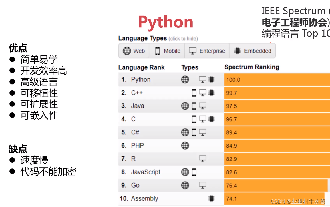通过一张简图了解一下python语言的优缺点,任何语言都有自己的优势,也有自己的劣势。python语言是对面对象语言,和C语言其他语言不同,面向对象开发好比建设一个车子,需要车架、发动机、变数器、底盘、轮胎还有其他座椅操控台,pyhon语言开发可以设置每个零部件,组装一台汽车就可以调用一个零部件使用。每个零部件就是相当于python的一个模块,可以随意调用