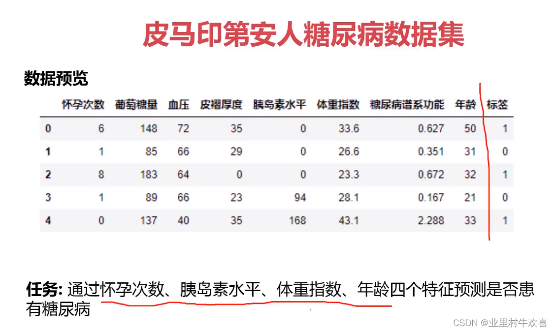 任务:通过怀孕次数、胰岛素水平、体重指数、年龄四个特征预测是否患有糖尿病