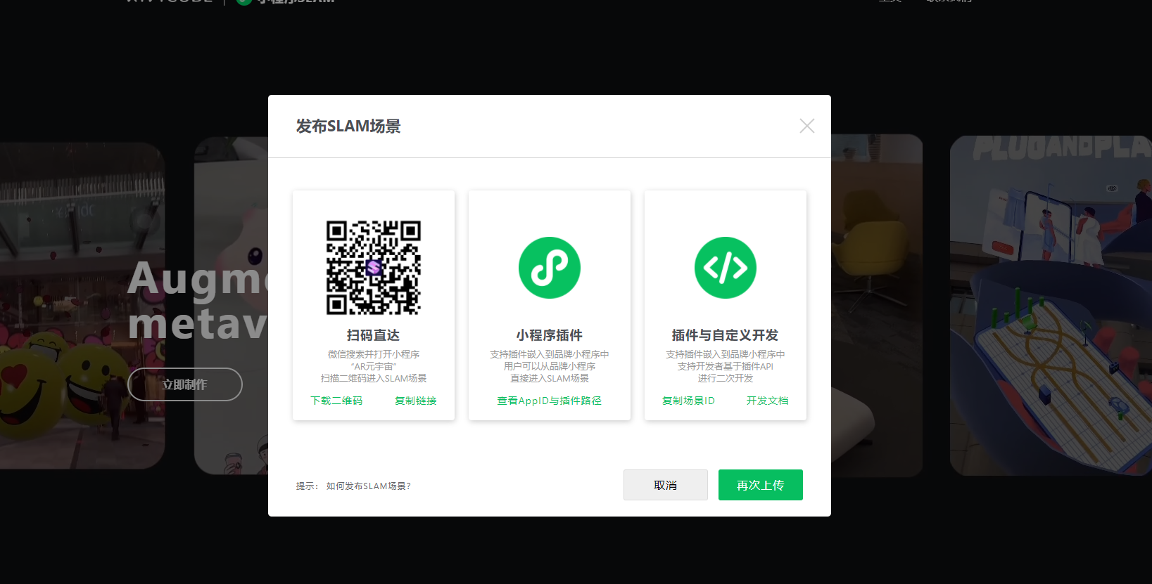 我分享一下解题思路,首先在第三平台kivicube上面创建一个账号,在创建一个AR的项目图,要求上传GLB文件。接着我们还是去第三方模型平台下载AR动画效果图,将下载好的AR动画效果图转化为GLB模式。回到kivicube平台进行上传,生成AR效果图,可以直接扫码看到AR效果图。如果想在小程序中调用AR效果图,生成小程序插件的APPID,将小程序的APPID授权在微信小程序后的后台中,最后再微信开发工具中调用SLAM第三方的组件进行调试,保存好上传版本到微信后台审核,发布之后就可以在小程序线上进行展示了。(因为精力有限,我只弄到在微信公众号开发工具上面呈现2D-AR效果,剩余3D的效果和小程序的发布版本就留着以后慢慢学习。)赶紧来实操.
