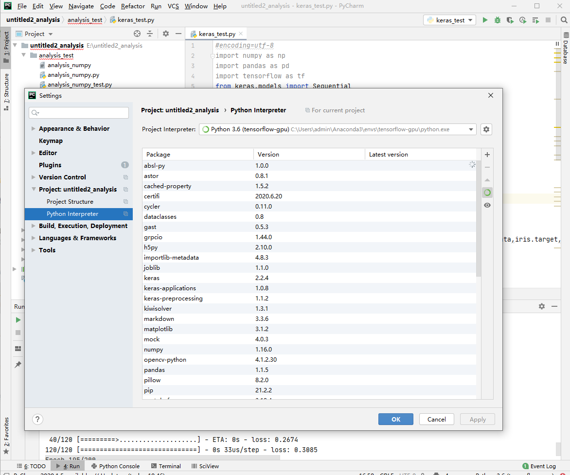 5、目前测试成功环境包的版本:pycharm2020.1,Anaconda3-2019.10-Windows-x86_64,tensorflow-gpu=1.13.2、keras2.1.5、scipy1.2.1、numpy1.16.0、