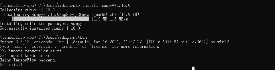 这里需要降级numpy的版本,下列截图是我删除版本后的操作,可以正常导入tensorflow和keras模块了。那么在pycharm里面就可以调用Anaconda的数据包