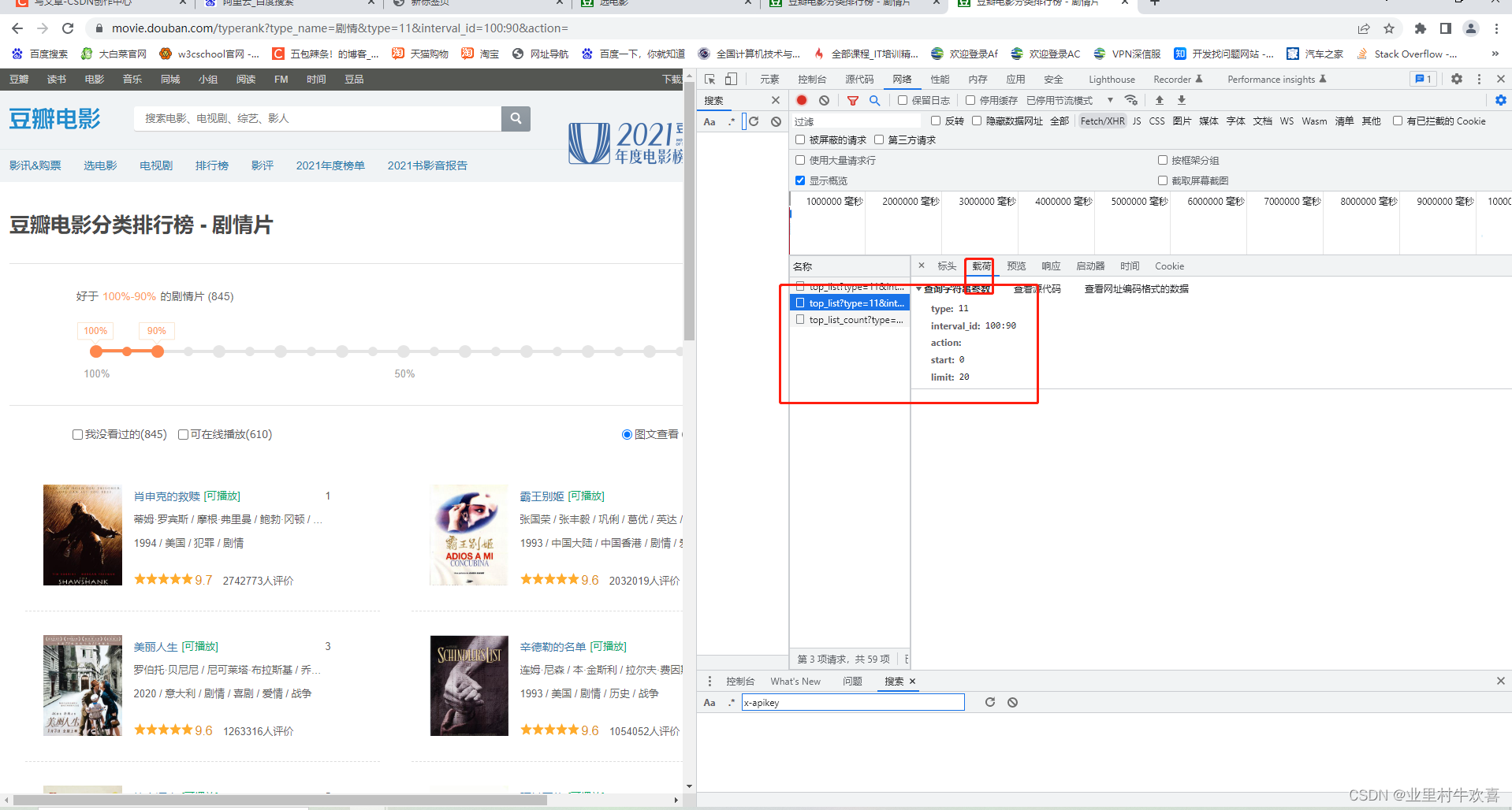 https://movie.douban.com/j/chart/top_list?(前部分是请求URL)type=11&interval_id=100:90&action=&start=0&limit=1(后半部分是请求参数,请求参数正好是载荷值)