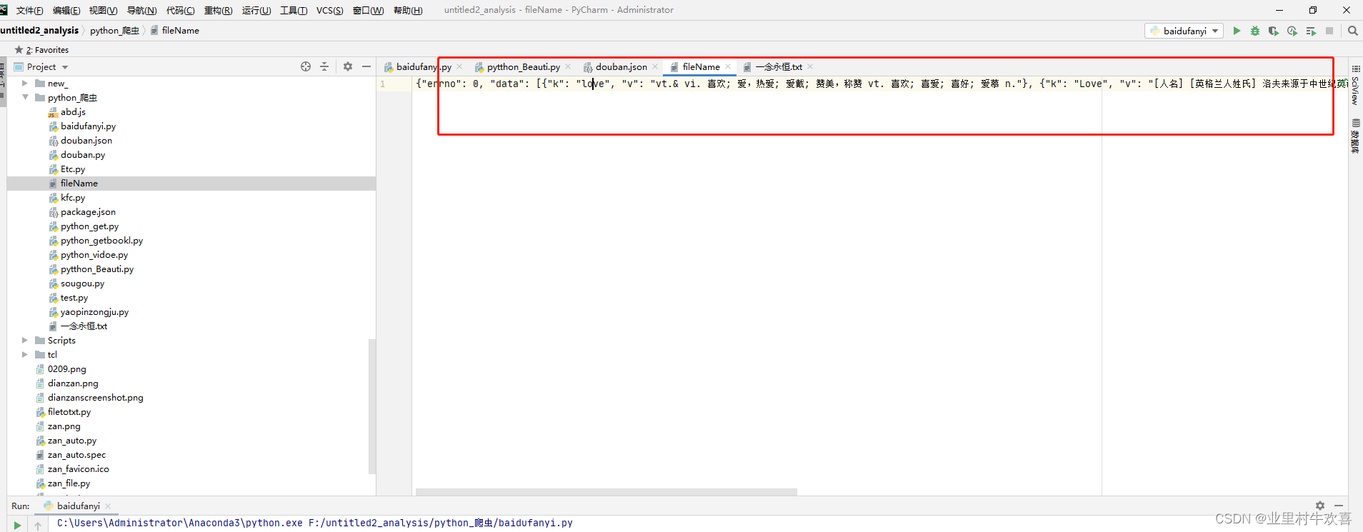 我需要爬取的网站是百度翻译的结果,这个百度翻译结果是我任意输入一个英文翻译出来的结果。我想要爬取翻译以后的英文单词,将英文单词的数据统统抓取下来了。