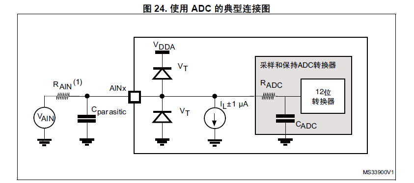 图中RAIN:外部输入阻抗,STM32芯片中这个值最大为50KΩ;