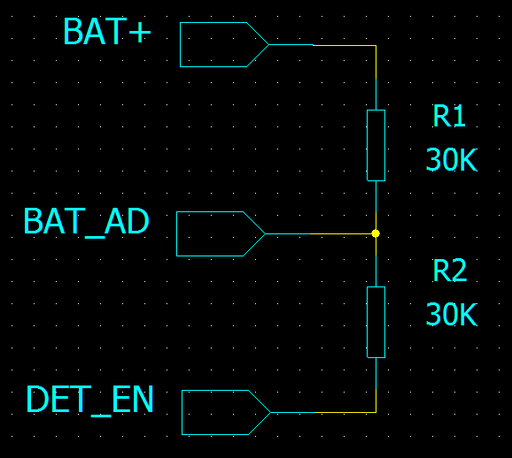 那么为了更准确地检测电池电压,那么只好把电阻改小。如果选两个50K的电阻,那么此处带来的电流会后42uA.所以在电路上做了个调整: