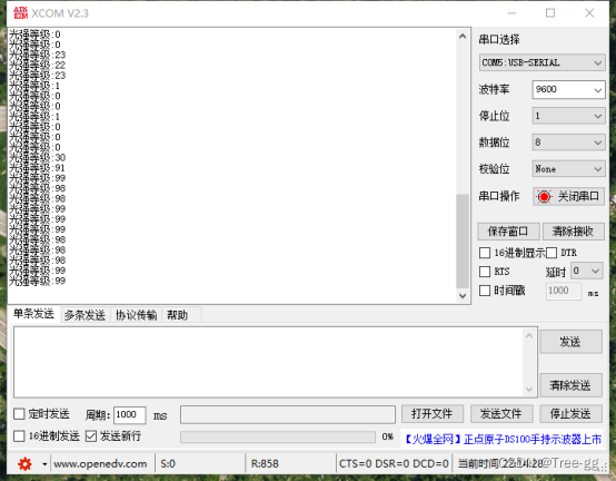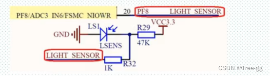 利用这个电流变化,我们串接一个电阻,就可以转换成电压的变化(功率一定情况下电压和电流成反比),从而通过ADC读取电压值,判断外部光线的强弱。