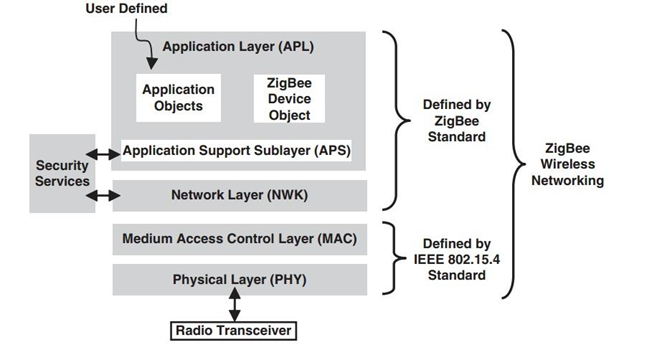ZigBee的协议分为两部分,IEEE802.15.4定义了PHY(物理层)和 MAC(介质访问层)技术规范,ZigBee联盟定义了NWK(网络层)、APS(应用程序支持子层)、APL(应用层)技术规范。ZigBee协议栈就是将各个层定义的协议都集合在一起,以函数的形式实现,并给用户提供一些应用层API,供用户调用。ZigBee 无线网络协议如下图所示: