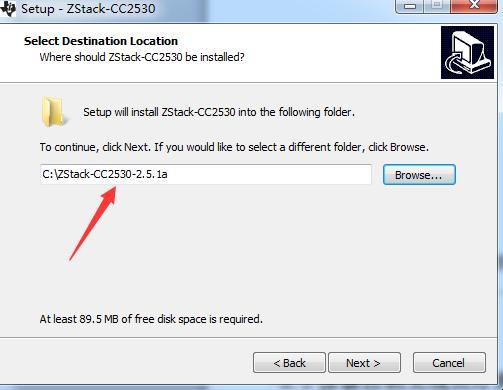 该协议栈可以在TI官网进行下载,下载后的文件为ZStack-CC2530-2.5.1a.exe,双击协议栈安装包进行安装,在安装过程中选择安装的位置,如图: