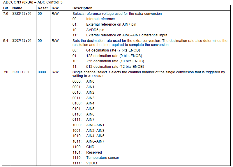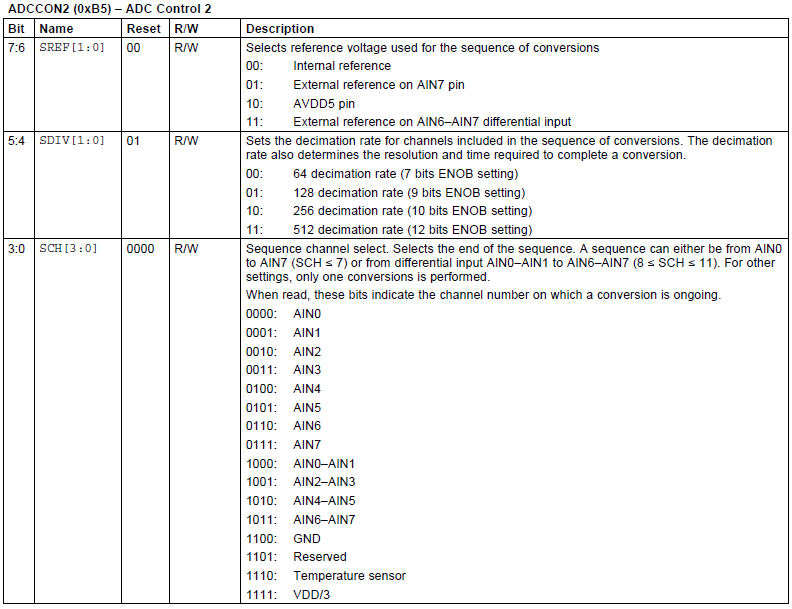 单端输入AIN0至AIN7可代表通道号0至7,通道号8至11分别代表差动输入AIN0-AIN1,AIN2-AIN3,AIN4-AIN5,AIN6-AIN7;通道12表示GND,通道13表示温度传感器,通道15表示AVDD5/3。这些值在ADCCON2.SCH和ADCCON3.SCH中设置。