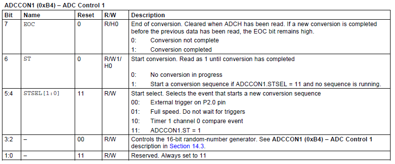 ADCCON1.STSEL是用于启动转换序列的触发方式的,对于单次ADC转换,个人感觉这样配置不好,以后对于单次ADC转换,不采用这种判断方式。