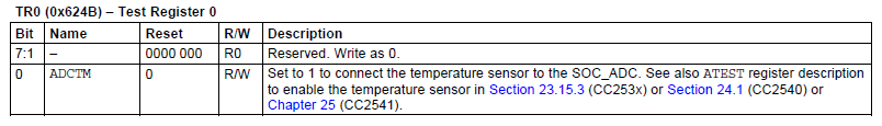 如果选择片上的温度传感器作为ADC温度测量的输入,则需要通过配置寄存器TR0和ATEST来获得片上温度,不过这个温度测量误差很大,我们一般不用,这里也就不给出例程了。
