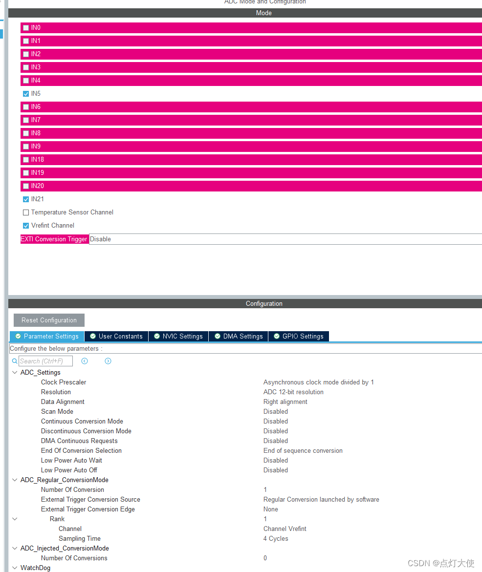 CudeMX中对相关ADC的配置 这里用ADC1的通道17