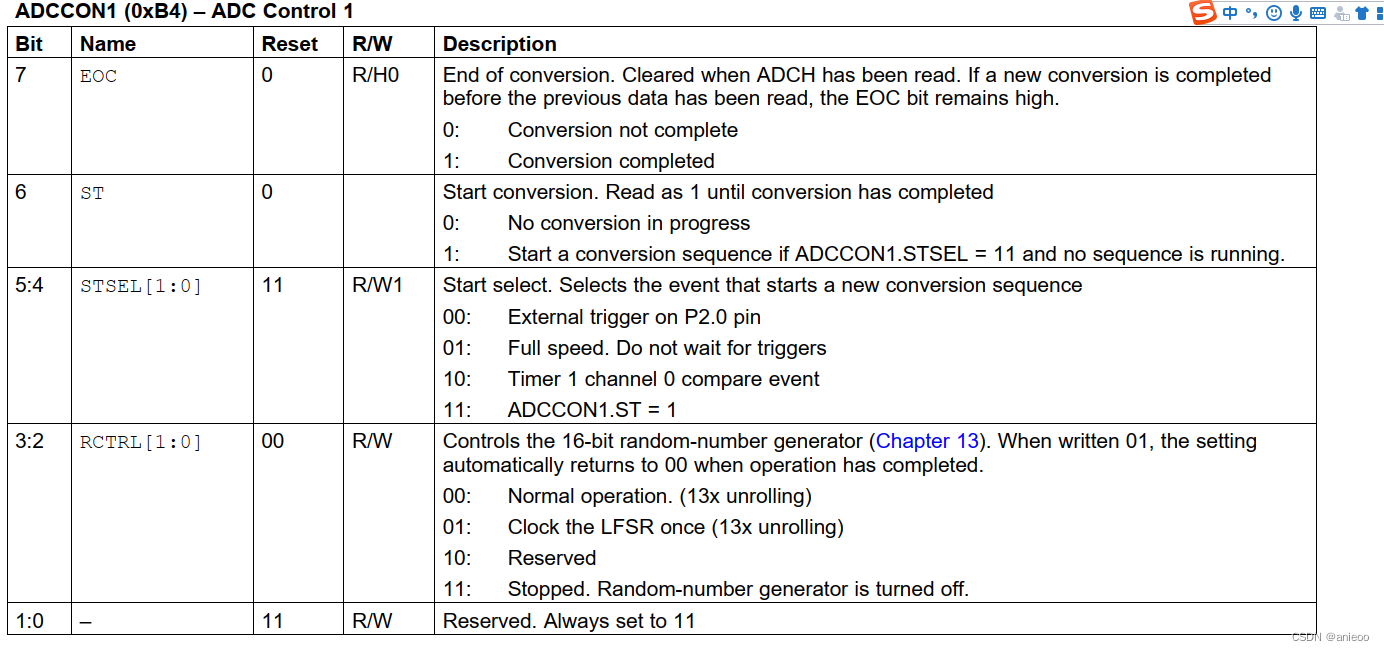 Bit[5:4]:设置ADC的采样精度,本实验设置为12,实际上计算的时候为13