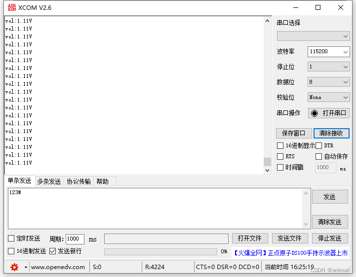 每间隔1000MS,将电池电压通过串口发送给上位机。