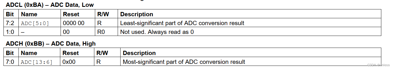 从图中可以看出,ADC的采样值由ADCH和ADCL共同组成,因此在读取数据的时候需要进行数据处理。
