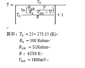 两个公式,一个可以从热敏电阻规格书中得到(热敏电阻与温度的关系),另一个是分压关系,