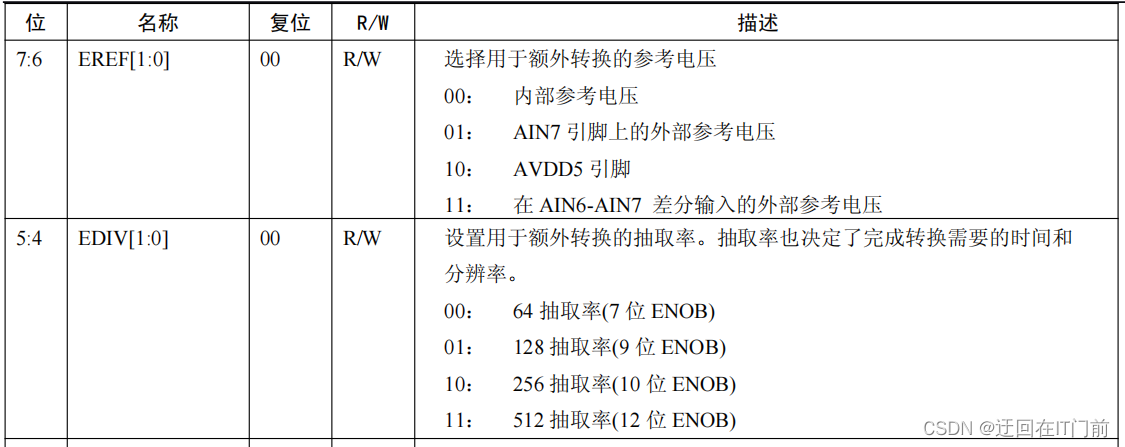 (4)通过ADCCON3配置ADC 参考电压和抽取率(本次选用AVDD5 引脚(3.3V)和选择512抽取率),模拟数字转换的正参考电压可选择为一个内部生成的电压,AVDD5 引脚;适用于 AIN7 输入引脚的外部电 压,或适用于 AIN6-AIN7 输入引脚的差分电压。