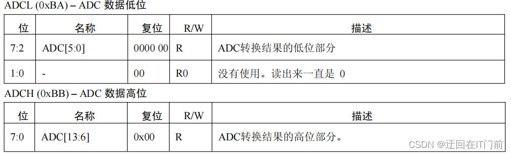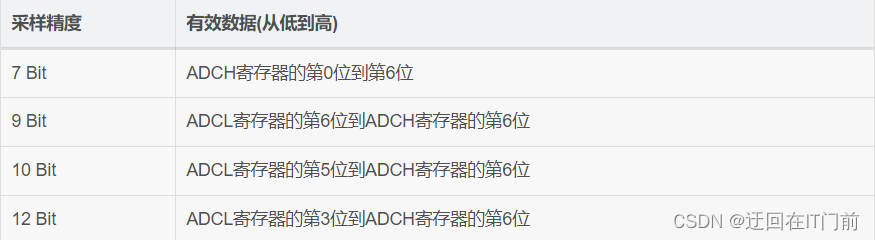 ADCL寄存器和ADCH寄存器保存的是AD转换完成的结果,数据以2的补码形式表现。下表为采样精度与有效数据解析表: