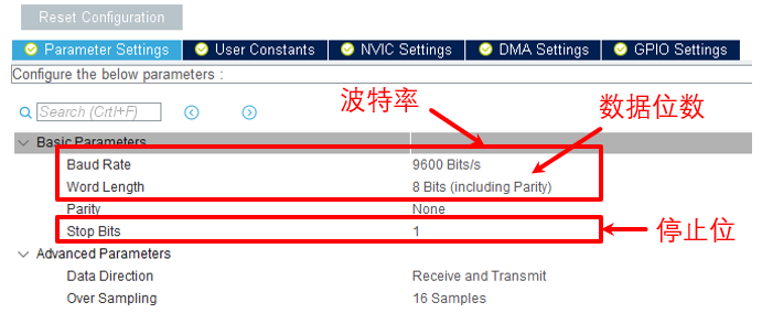 - 4. 设置USART1的参数,通用的“96-N-8-1”模式,即波特率9600,N校验位(无校验),数据位数为8,停止位为1位: