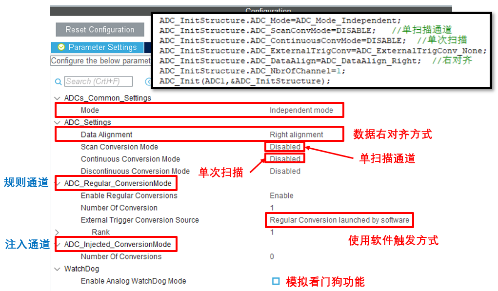 分别设置模式,单单个扫描和单次扫描,并在规则通道参数设置中设置为软件触发的方式。(对应的标准库代码在右上角)。