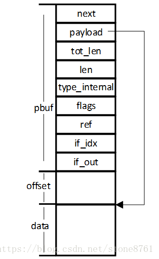1) PBUF_RAM类型的pbuf结构是一块很大的内存空间,内存首部是pbuf结构,实际数据接在后面,发送数据时常使用这种类型。如图 2.1所示;