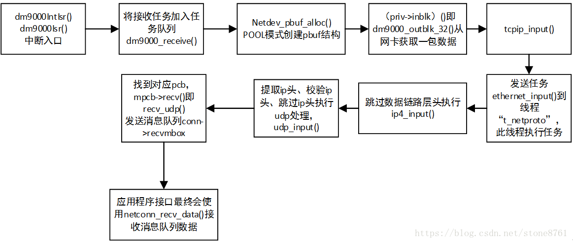 2) 在dm9000_receive()中首先会创建一个POOL类型的pbuf结构,再调用驱动接口priv->inblk()从网卡中提取报文放入pbuf结构中,执行tcpip_input()处理这个数据包;