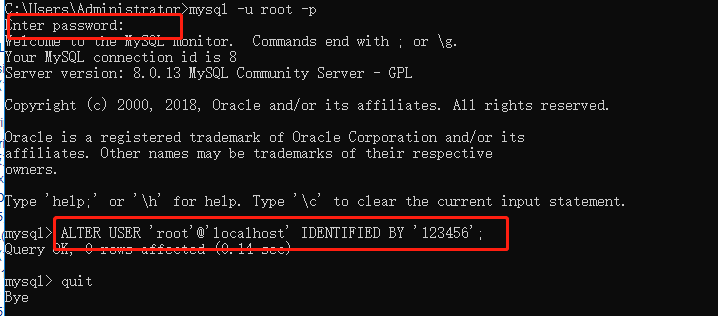 输入quit,退出当前登录,输入登录命令:mysql -u root -p