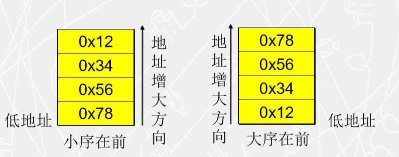 举个栗子: 数据0x12345678在存储的时候是分成 0x12 0x34 0x56 0x78 四个bytes在内存中存储的