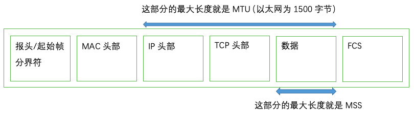 第一个因素是每个网络包能够容纳的最大数据长度MSS(Maximum Segment Size 最大分段大小),在说MSS之前我们先来了解另一个名词MTU(Maximum Transmission Unit 最大传输单元),MTU表示一个网络包的最大长度,在以太网中一般为1500字节。MTU是包含头部的总长度,而MSS则是去除头部之后的数据长度。具体如下图(起始帧分界符 Start Frame Delimiter SFD、帧校验序列 Frame Check Sequence FCS):