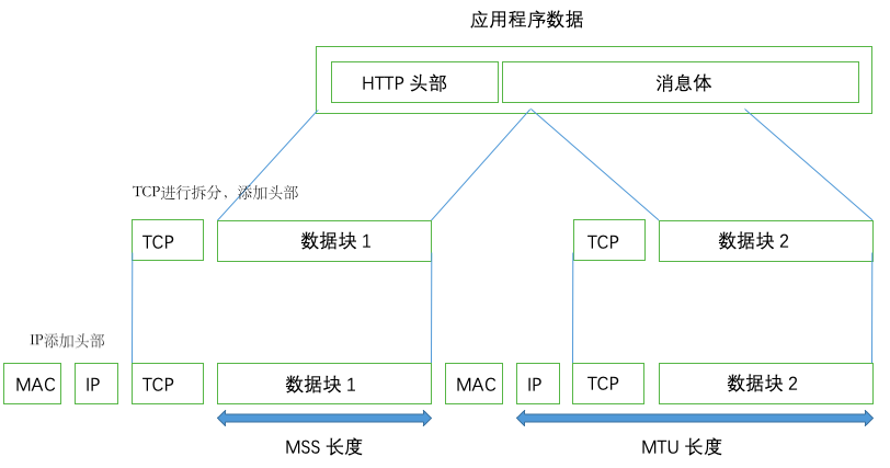 当需要发送的消息超过MSS的时候,缓冲区中的数据会被以MSS长度为单位进行拆分,拆分出来的每块数据会被放进单独的网络包中。具体情况如下图: