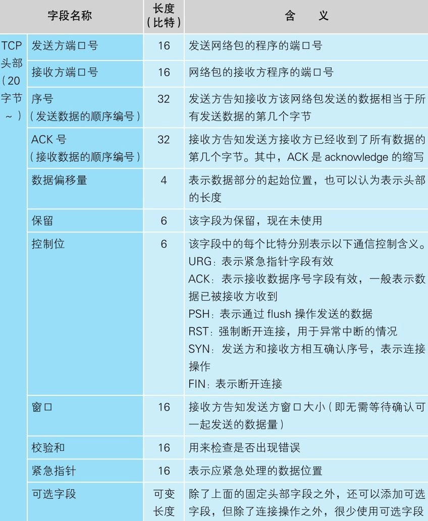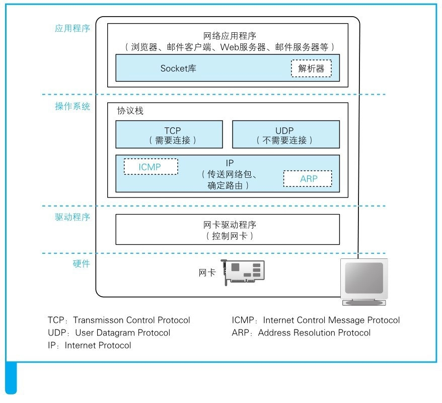协议栈的上半部分有两块,分别是负责用TCP协议收发数据的部分和负责用UDP协议收发数据的部分,它们会接受应用程序的委托执行收发数据的操作。像浏览器、邮件等一般的应用程序都是使用TCP收发数据的,而像DNS查询等收发较短的控制数据的时候则使用UDP。下面一半是用IP协议控制网络包收发操作的部分,网络包发送给通信对象的操作就是由IP来负责。ICMP用于告知网络包传送过程中产生的错误以及各种控制消息,ARP用于根据IP地址查询相应的以太网MAC地址。IP下面的网卡驱动程序负责控制网卡硬件,而最下面的网卡则负责完成实际的收发操作,也就是对网线中的信号执行发送和接收的操作。