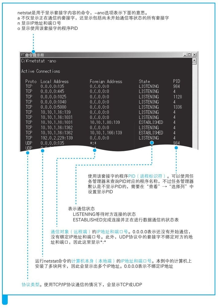 2. 套接字的实体就是通信控制信息(或者说存放控制信息的内存空间就是套接字的实体),协议栈是根据套接字中记录的控制信息来工作的,这也就是套接字的作用。Windows中可以用netstat命令显示套接字内容: