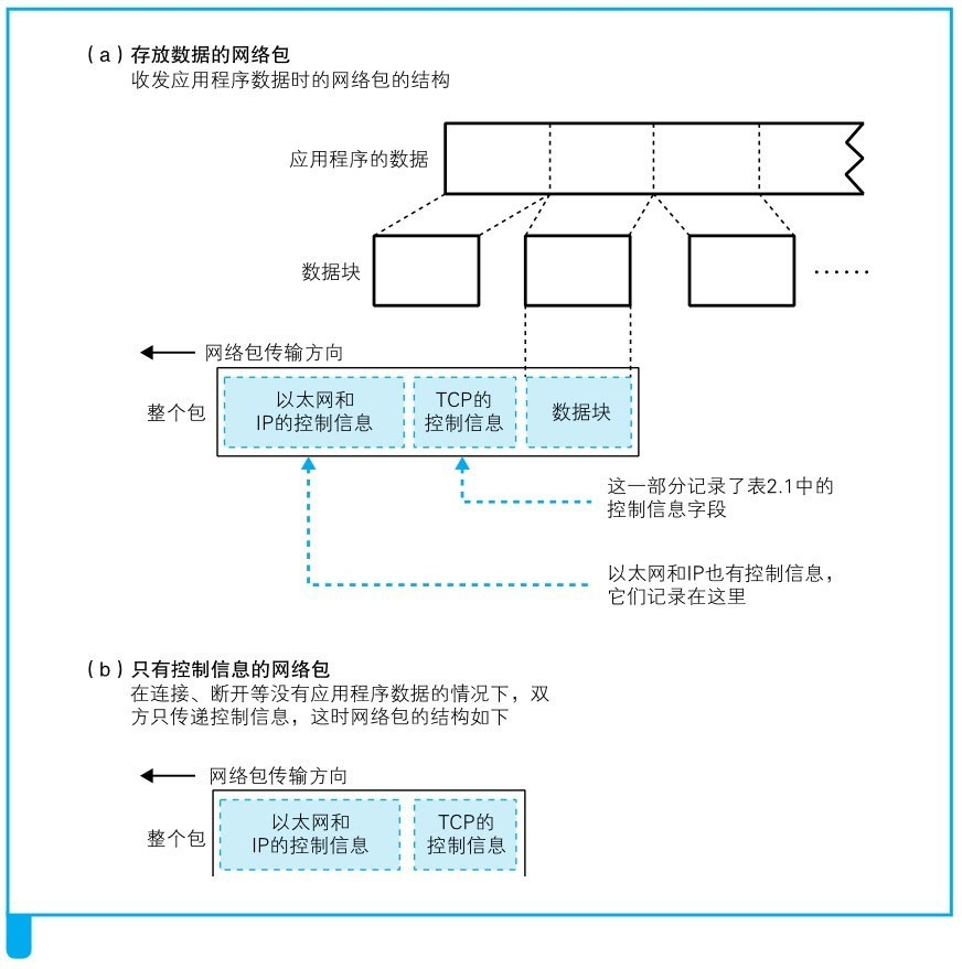 1. 连接实际上是通信双方交换控制信息,在套接字中记录这些必要信息并准备数据收发的一连串操作。通信操作中使用的控制信息分为两类:(1)头部中记录的信息,(2)套接字(协议栈中的内存空间,应用程序传递来的信息以及从通信对象接收到的信息都会保存在这里,还有收发数据操作的执行状态等信息也会保存在这里)中记录的信息。当执行数据收发操作时,我们还需要一块用来临时存放要收发的数据的内存空间,这块内存空间称为缓冲区,它也是在连接操作的过程中分配的。