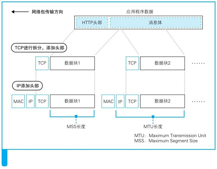 1. 首先应用程序将HTTP请求消息交给协议栈,一次将多少数据交给协议栈是由应用程序自行决定的。协议栈并不是一收到数据就马上发送出去,而是会将数据存放在内部的发送缓冲区中。要积累多少数据才能发送,不同种类和版本的操作系统会有所不同。第一个判断要素是每个网络包能容纳的数据长度(应用程序收到的数据长度超过或者接近MSS时再发送出去,如下图)。另一个判断要素是时间,协议栈有一个计时器,当应用程序发送数据的频率不高的时,经过一定时间之后,就算MSS未满也会把网络包发送出去。在进行发送操作时需要综合考虑这两个要素以达到平衡。不过,TCP协议规格中并没有告诉我们怎样才能平衡,因此实际如何判断是由协议栈的开发者来决定的。有时,应用程序在发送数据时也可以指定一些选项,比如如果指定“不等待填满缓冲区直接发送”,则协议栈就会按照要求直接发送数据。