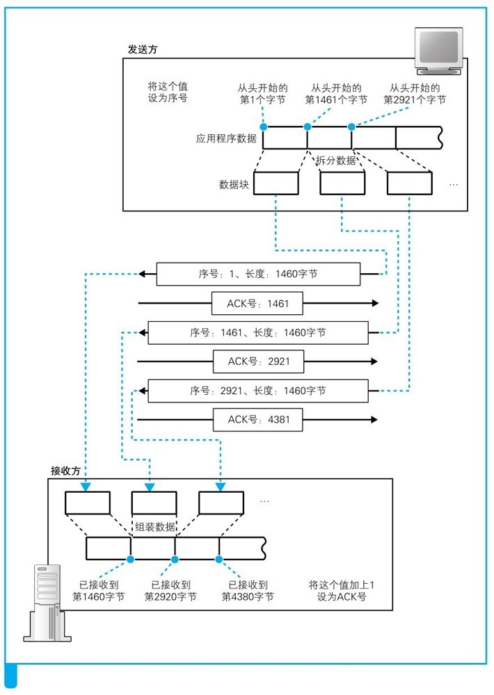 c. 数据收发阶段的操作根据应用程序的不同而有一些差异,以Web为例,首先客户端会向服务器发送请求消息。TCP会将请求消息切分成一定大小的块,并在每一块前面加上TCP头部,然后发送给服务器。TCP头部中包含序号,它表示当前发送的是第几个字节的数据。当服务器收到数据时,会向客户端返回ACK号。在最初的阶段,服务器只是不断接收数据,随着数据收发的进行,数据不断传递给应用程序,接收缓冲区就会被逐步释放。这时,服务器需要将新的窗口大小告知客户端。当服务器收到客户端的请求消息后,会向客户端返回响应消息,这个过程和刚才的过程正好相反。