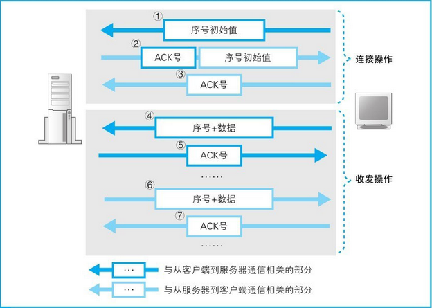 在实际的通信中,序号并不是从1开始的,而是需要用随机数计算出一个初始值,这是因为如果序号都从1开始,通信过程就会非常容易预测,有人会利用这一点来发动攻击。在之前的连接(connect)过程中,有一个将SYN控制位设为1并发送给服务器的操作,就是在这一步将序号的初始值告知对方的。实际上,在将SYN设为1的同时,还需要同时设置序号字段的值,而这里的值就代表序号的初始值。