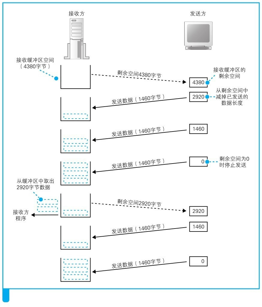 当接收方的TCP收到包后,会先将数据存放到接收缓冲区中。然后,接收方需要计算ACK号,将数据块组装起来还原成原本的数据并传递给应用程序,如果这些操作还没完成下一个包就到了,包会被暂存在接收缓冲区中。如果数据到达的速率比处理数据并传递给应用程序的速率还要快,那么接收缓冲区中的数据会越堆越多,最后就会溢出,后面的数据也就进不来了。我们可以通过下面的方法来避免这种情况的发生。首先,接收方需要告诉发送方自己最多能接收多少数据,然后发送方根据这个值对数据发送操作进行控制,这就是滑动窗口方式的基本思路。能够接收的最大数据量称为窗口大小,它是TCP调优参数中非常有名的一个。