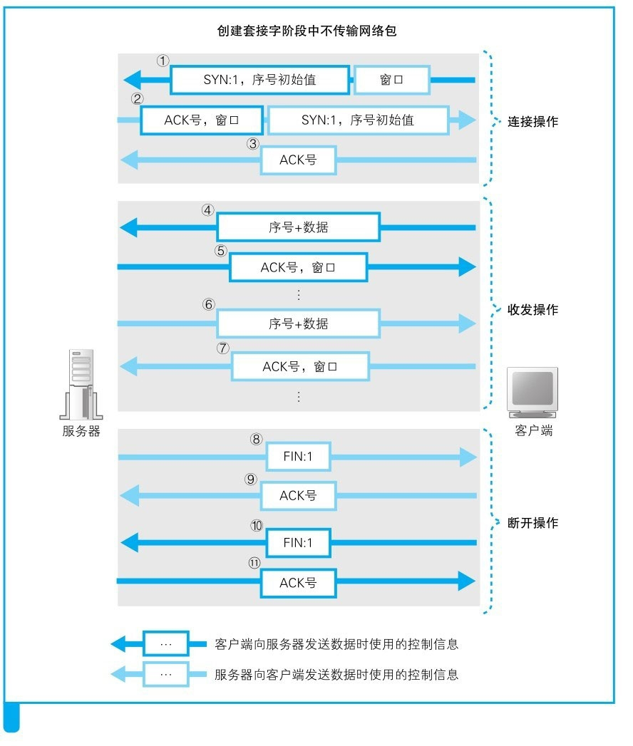d. 服务器的响应消息发送完毕之后,数据收发操作就结束了,这时就会开始执行断开操作。以Web为例,服务器会先发起断开过程(也可由客户端发起)。在这个过程中,服务器先发送一个FIN为1的TCP包,然后客户端返回一个表示确认收到的ACK号。接下来,双方还会交换一组方向相反的FIN为1的TCP包和包含ACK号的TCP包。最后,在等待一段时间后,套接字会被删除。