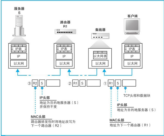 (2)子网中的以太网协议将包传输到下一个转发设备