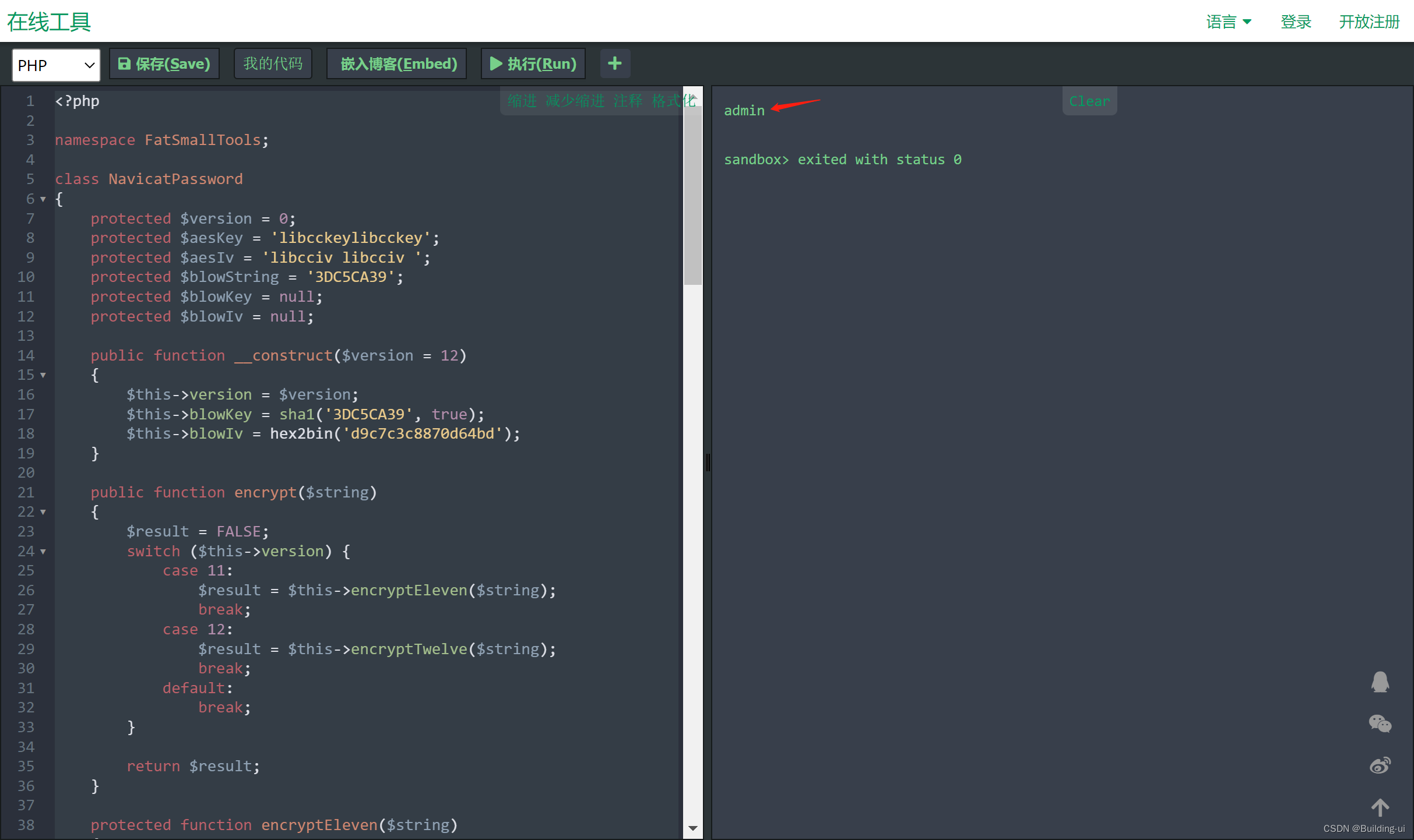 复制下面这段php代码,可以直接在网站运行https://tool.lu/coderunner/,将上一步复制的密码替换代码中倒数第二行的密码,运行程序,得到密码。