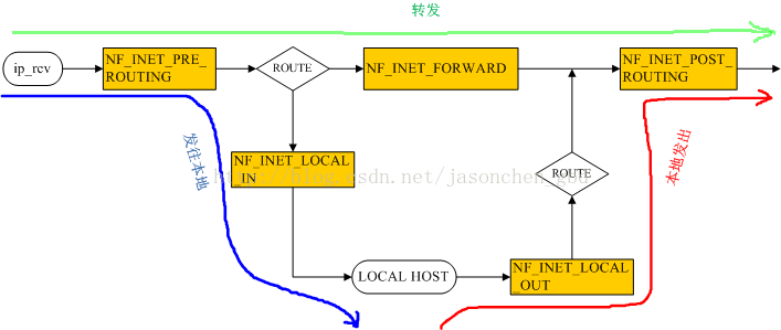 对于发往本地的数据包,会依次经过NF_INET_PRE_ROUTING和NF_INET_LOCAL_IN两个hook点的处理。