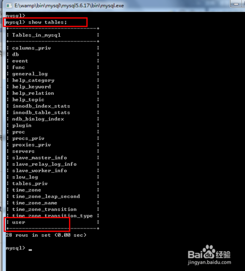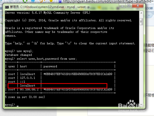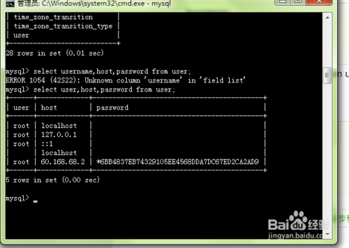 6.其中mysql库就是保存用户名的地方。输入 use mysql; 选择mysql数据库。