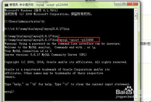 4.然后直接输入mysql,不需要带任何登录参数直接回车就可以登陆上数据库。