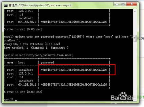 10.再次查看账户信息,select user,host,password from user; 可以看到密码已被修改。